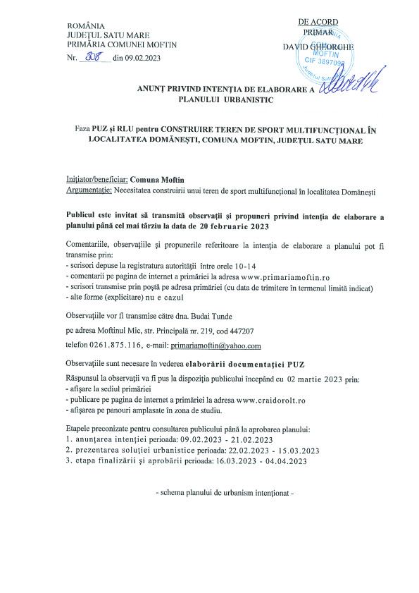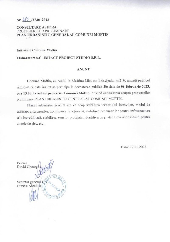 dezbaterea publică în scopul consultării publicului pentru identificarea intereselor mutuale din zonă, în data de 03.02.2023, ora 10:00, la sediul Primăriei comunei Moftin.