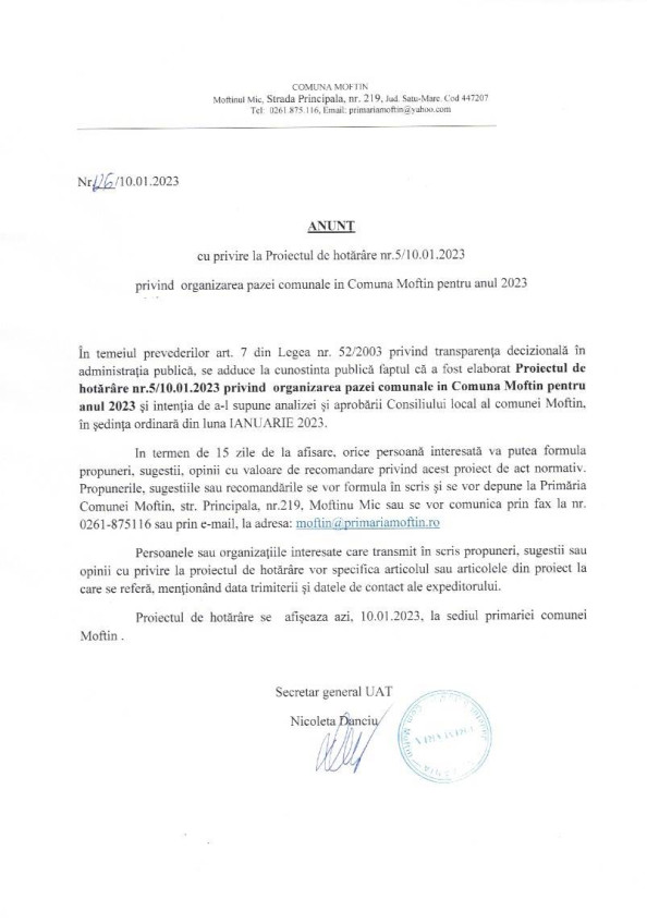 În temeiul prevederilor art. 7 din Legea nr. 52/2003 privind transparenţa decizională în administraţia publică, se publică spre cunoştinţă generală faptul că a fost elaborat Proiectul de hotărâre nr.20/2023 privind stabilirea impozitelor şi taxelor locale pe anul 2024, in comuna Moftin şi intenţia de a-l supune analizei şi aprobării Consiliului local al comunei Moftin ,în şedinţa ordinară din luna APRILIE 2023.