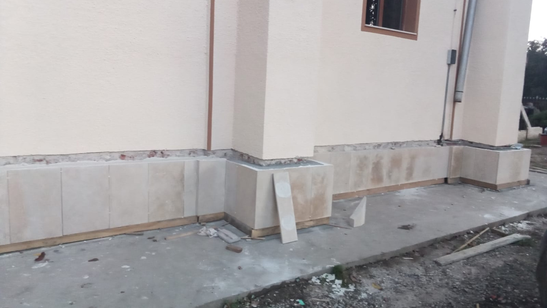 Partea de fundație-soclu-este îmbrăcat în piatră de Viștea- ( folosit la Casa Poporului București), la a cărei achiziții într-un procent semnificativ a contribuit familia Domnului Primar David Gheorghe, diferența venind  din partea credincioșilor.