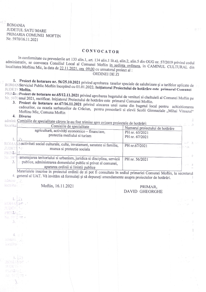 In conformitate cu prevederile art 133 alin.1, art. 134 alin.1 lit.a), alin.2, alin.5 din OUG nr. 57/2019 privind codul administrativ, se convoaca Consiliul Local al Comunei Moftin in sedinta ordinara, in CAMINUL CULTURAL din localitatea Moftinu Mic, la data de 01.11.2021, ora 09,00 cu urmatorul proiect al :