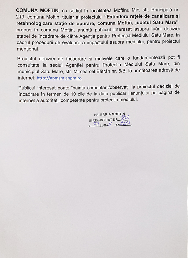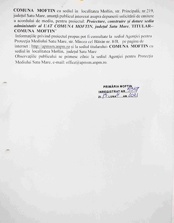 Proiectul de hotărâre este afişat la sediul primariei si publicat pe site-ul Primăriei Comunei Moftin .
