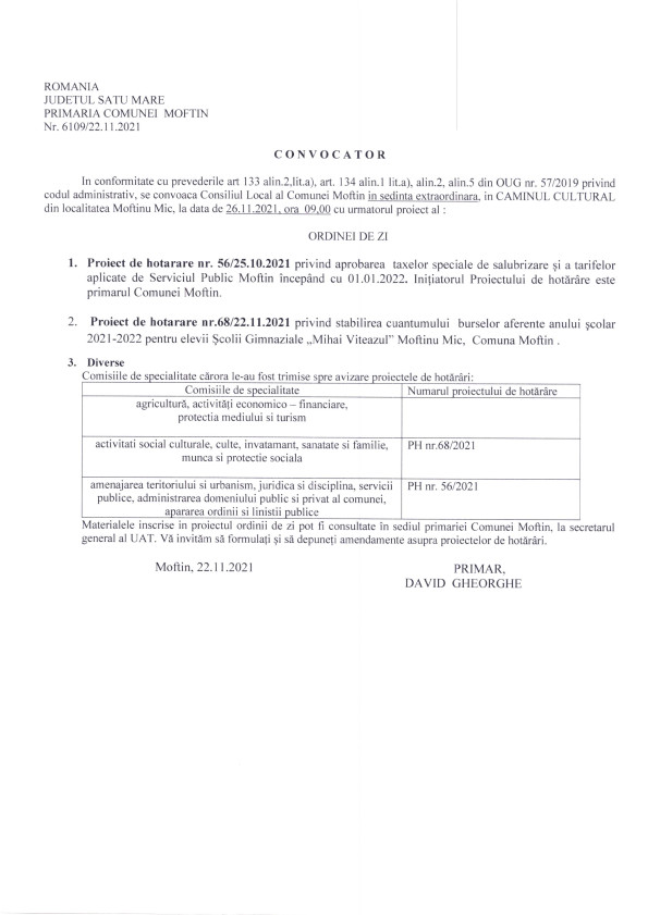 In conformitate cu prevederile art 133 alin.2 lit.a), art. 134 alin.1 lit.a), alin.2, alin.3,lit.b), alin.4, alin.5 din OUG nr. 57/2019 privind codul administrativ, se convoaca Consiliul Local al Comunei Moftin in sedinta extraordinară, cu convocare de îndată, in CAMINUL CULTURAL din localitatea Moftinu Mic, la data de 05.11.2021, ora 13,00 cu urmatorul proiect al :