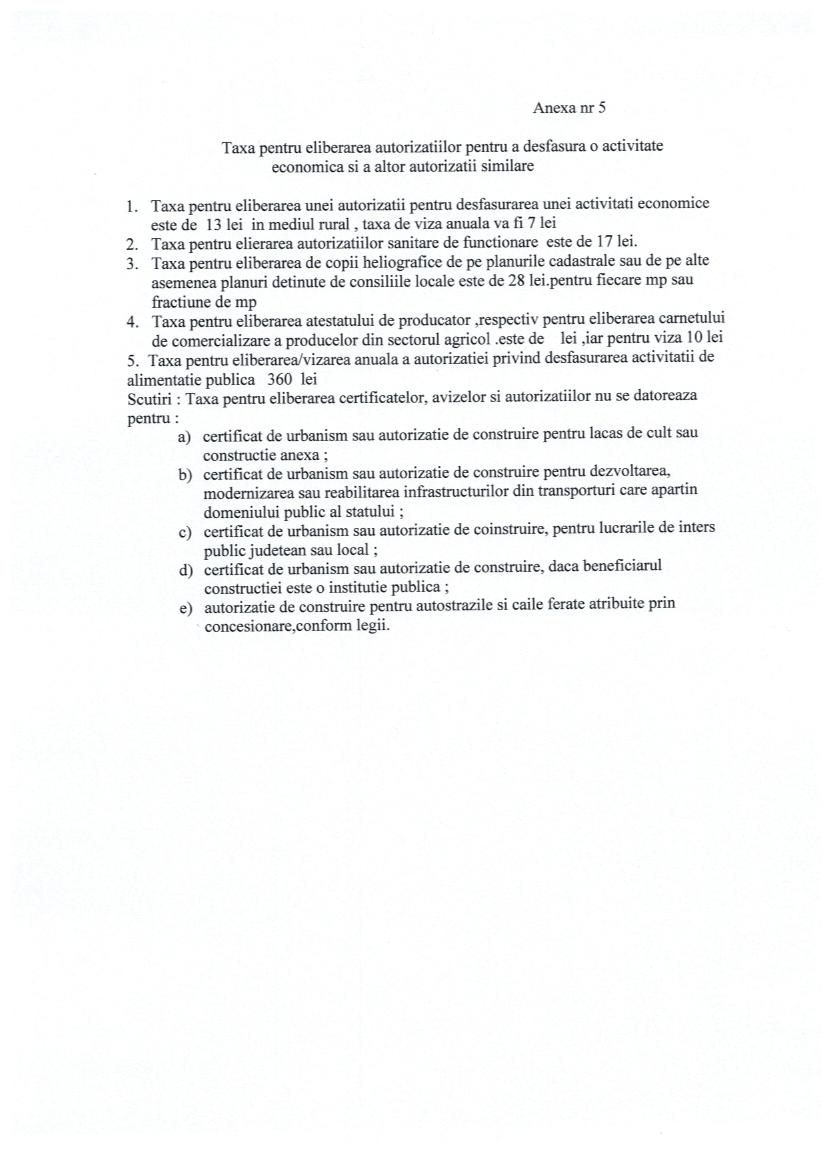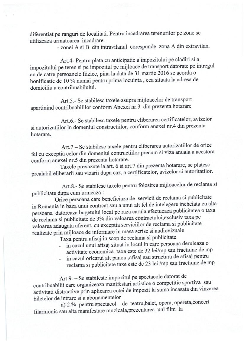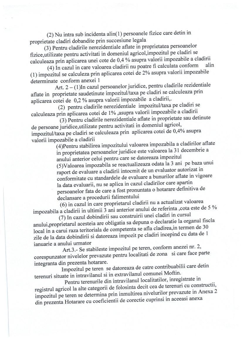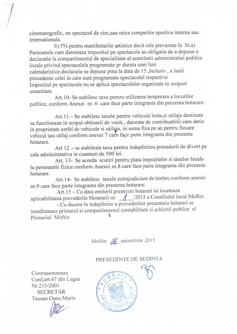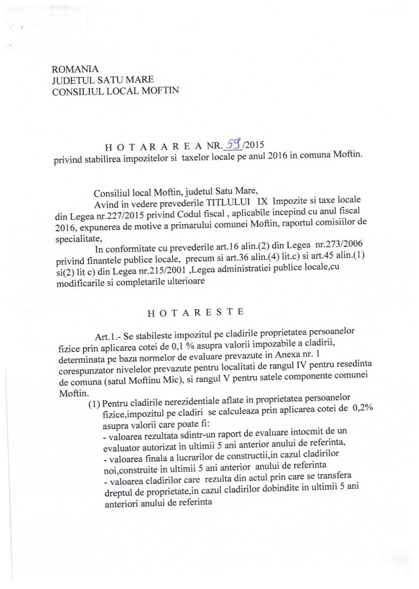 Hot nr 59 priviind stabilirea impozitelor si taxelor locale pe 2016 in comuna Moftin