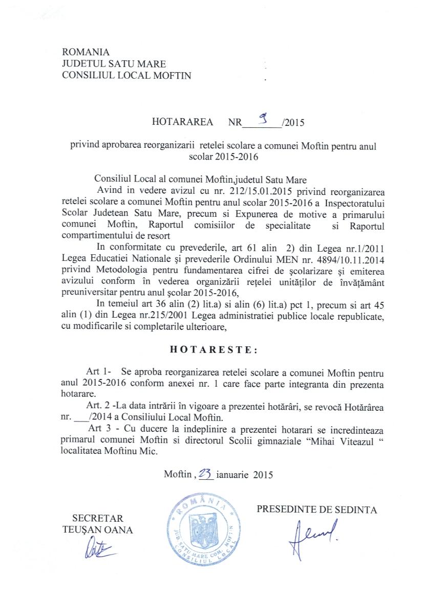 Hot nr 9 privind aprobarea reorganizarii retelei scolare a comunei Moftin pentru anul scolar 2015-2016