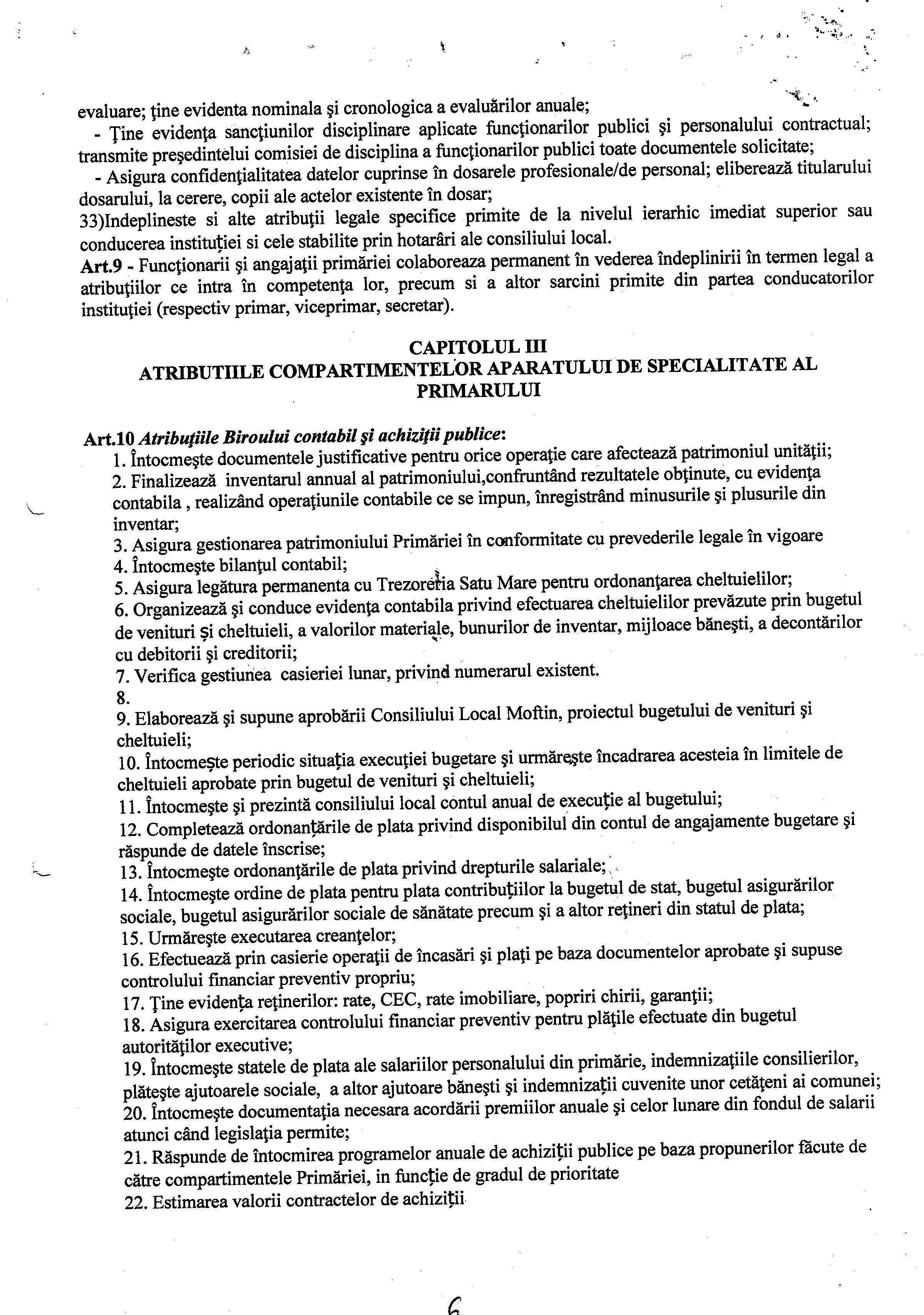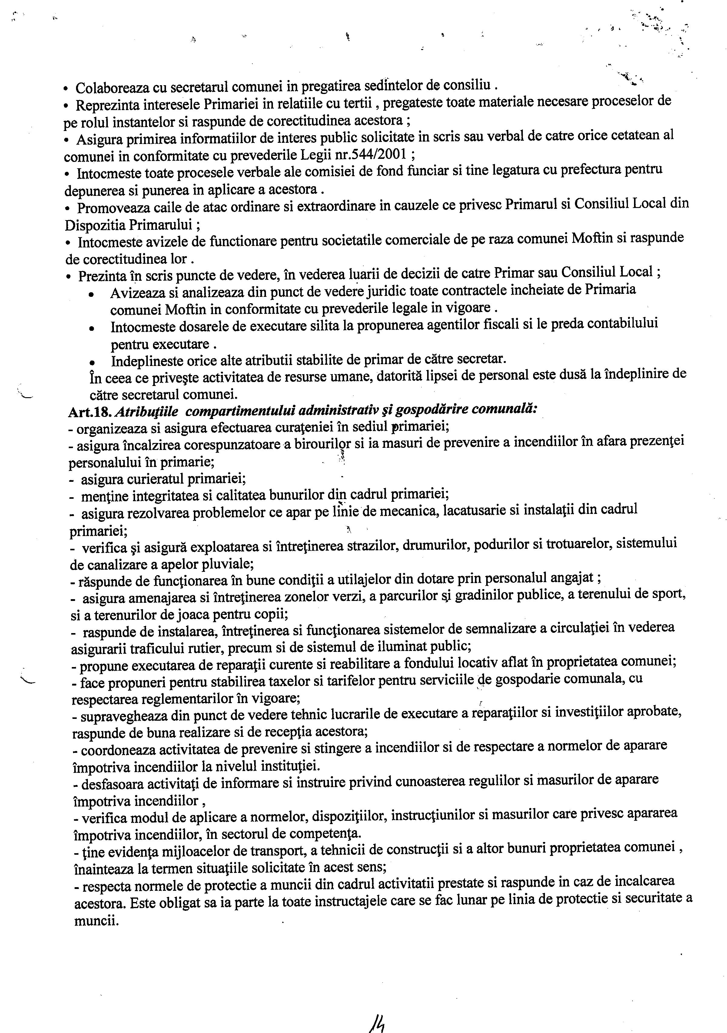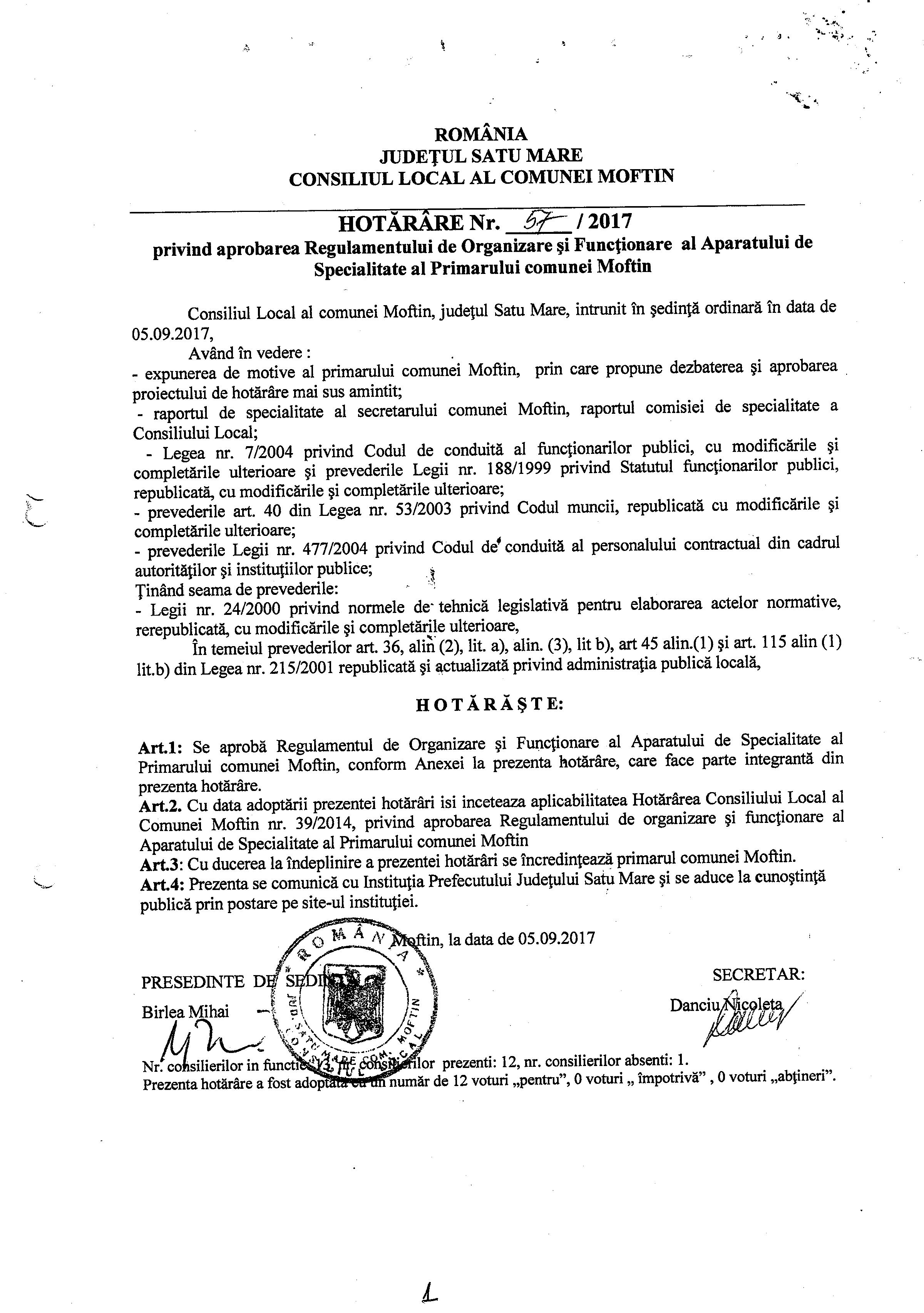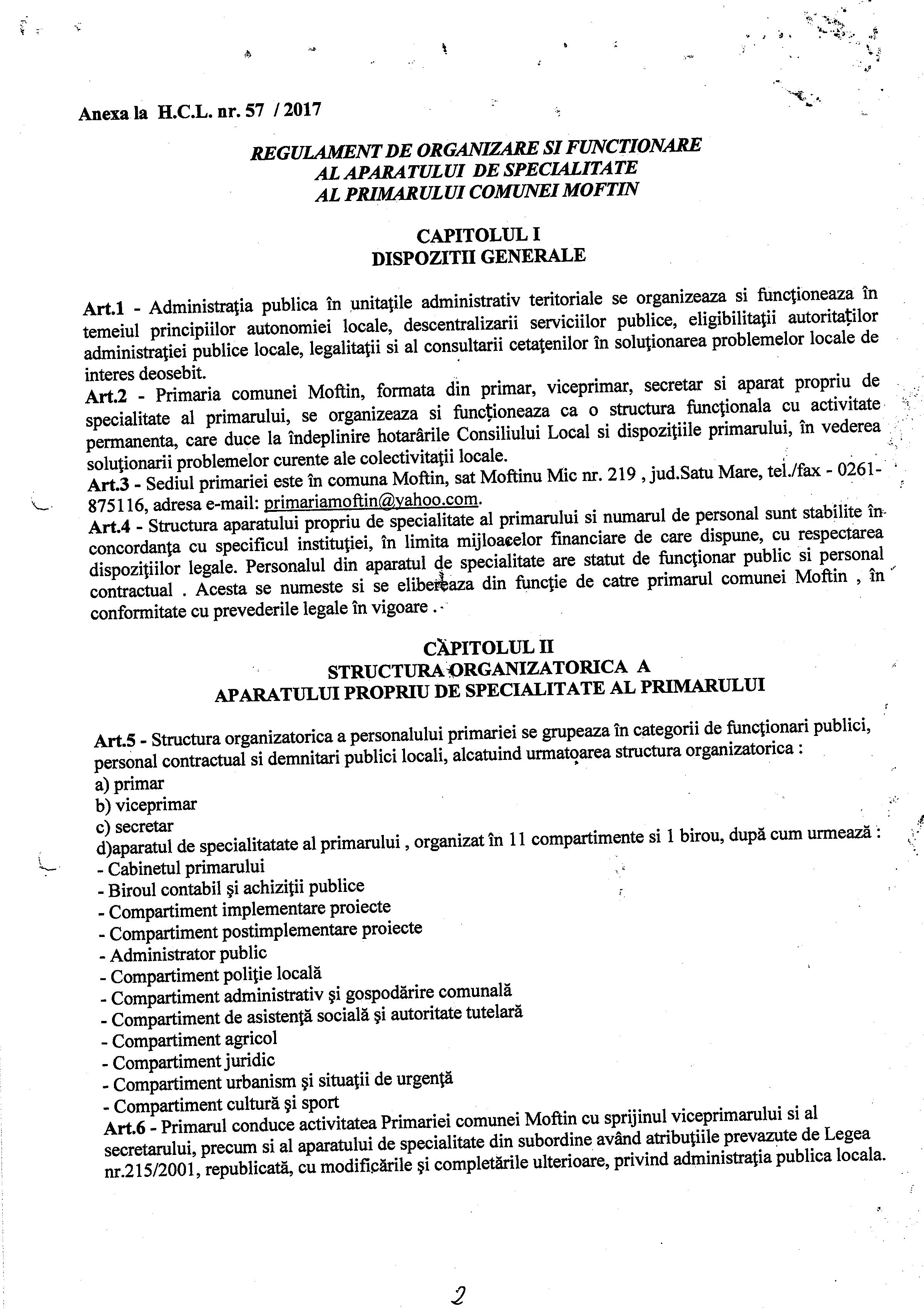 Hot. 57 - aprobare regulament de organizare si functionare al aparatului de specialitate al primarului Comunei Moftin